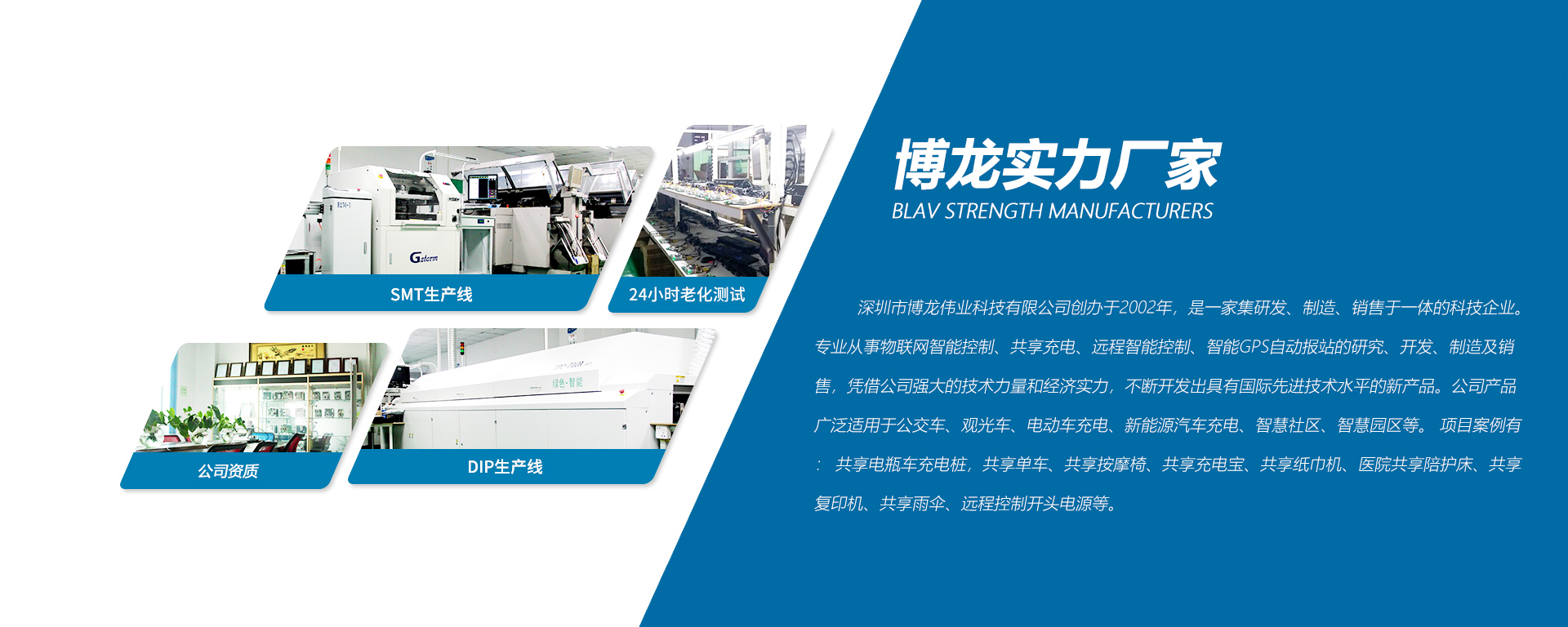 成立時間:深圳市博龍偉業科技有限公司創辦于2002年,是一家集研發、制造、銷售于一體的科技型企業。自主研發車載GPS報站器、車載視頻設備及安防視頻監控、充電樁、智能遠程控制等產品;產品廣泛應用于共享單車,共享按摩椅,共享充電寶,共享紙巾機,醫院共享陪護床,共享復印機,共享雨傘,共享電動車充電樁,充電柜,換電柜,遠程控制開關電源,電池保護板等。 公司嚴執行該質量體系,對生產品質進行全方位控制,公司擁有雄厚的技術力量、先進的生產、檢測設備、十余年的團隊管理與生產經驗。曾先后榮獲多項專利和軟件著作權等。 我們的設計理念:安全低耗,高性能,低成本。博龍偉業以"專心、專業、專注"的